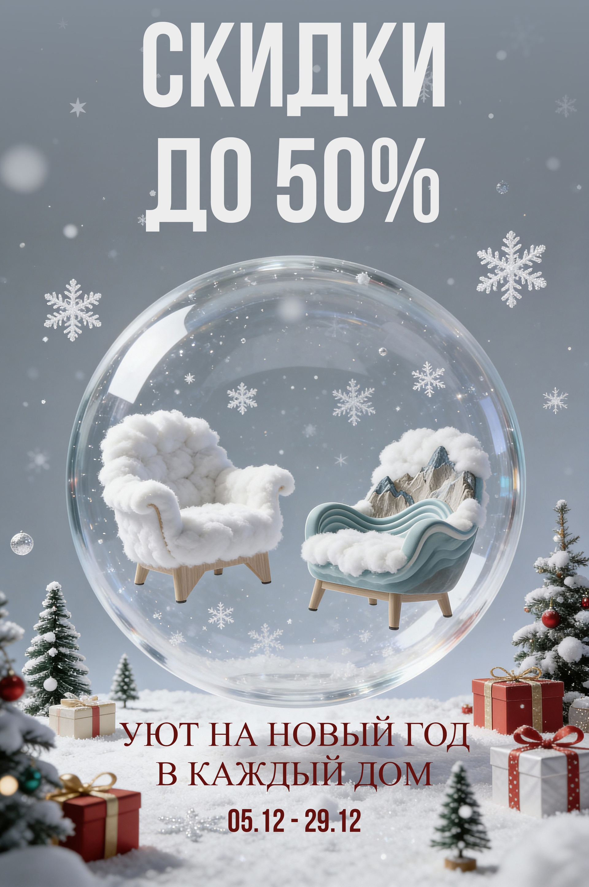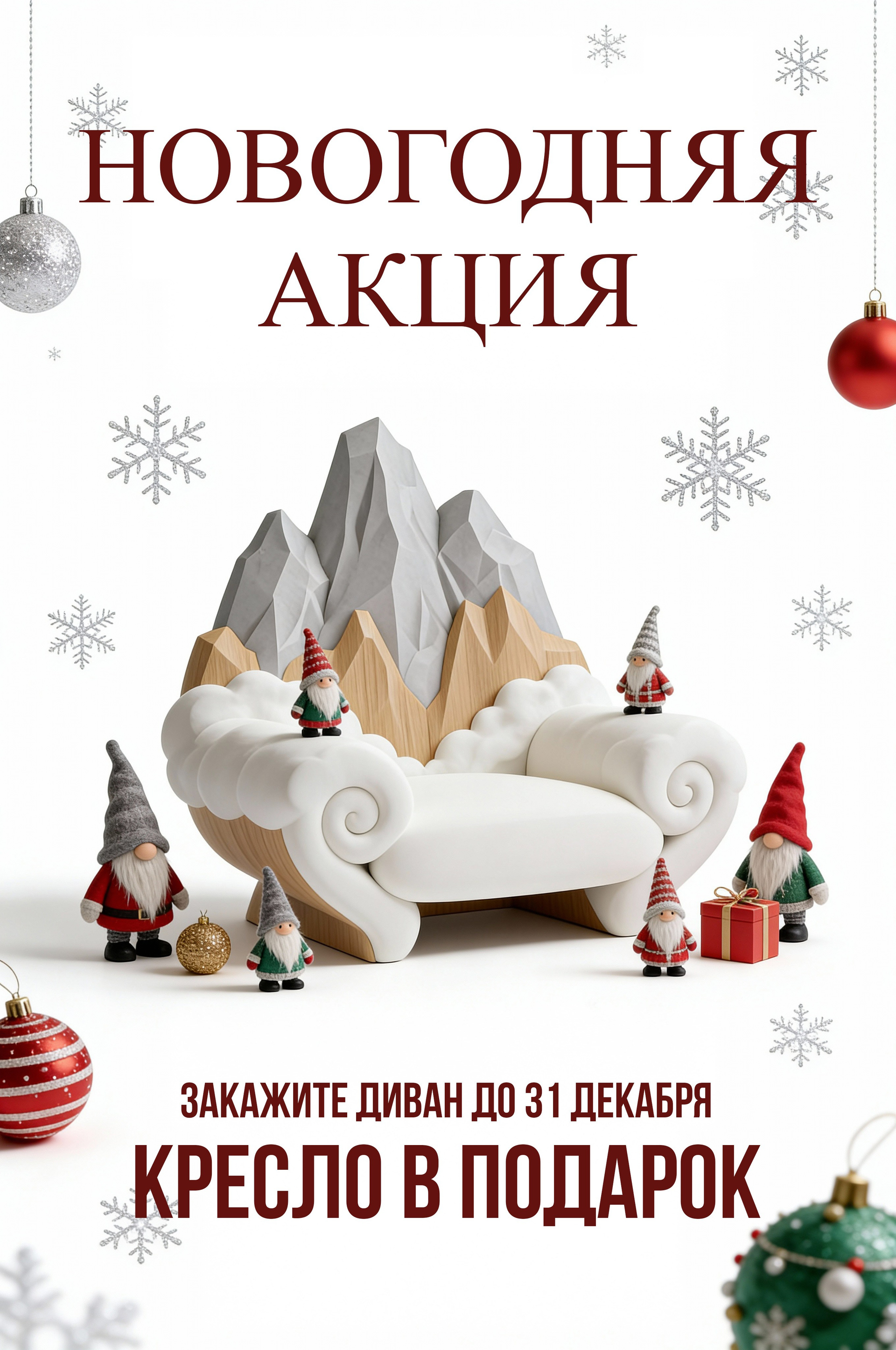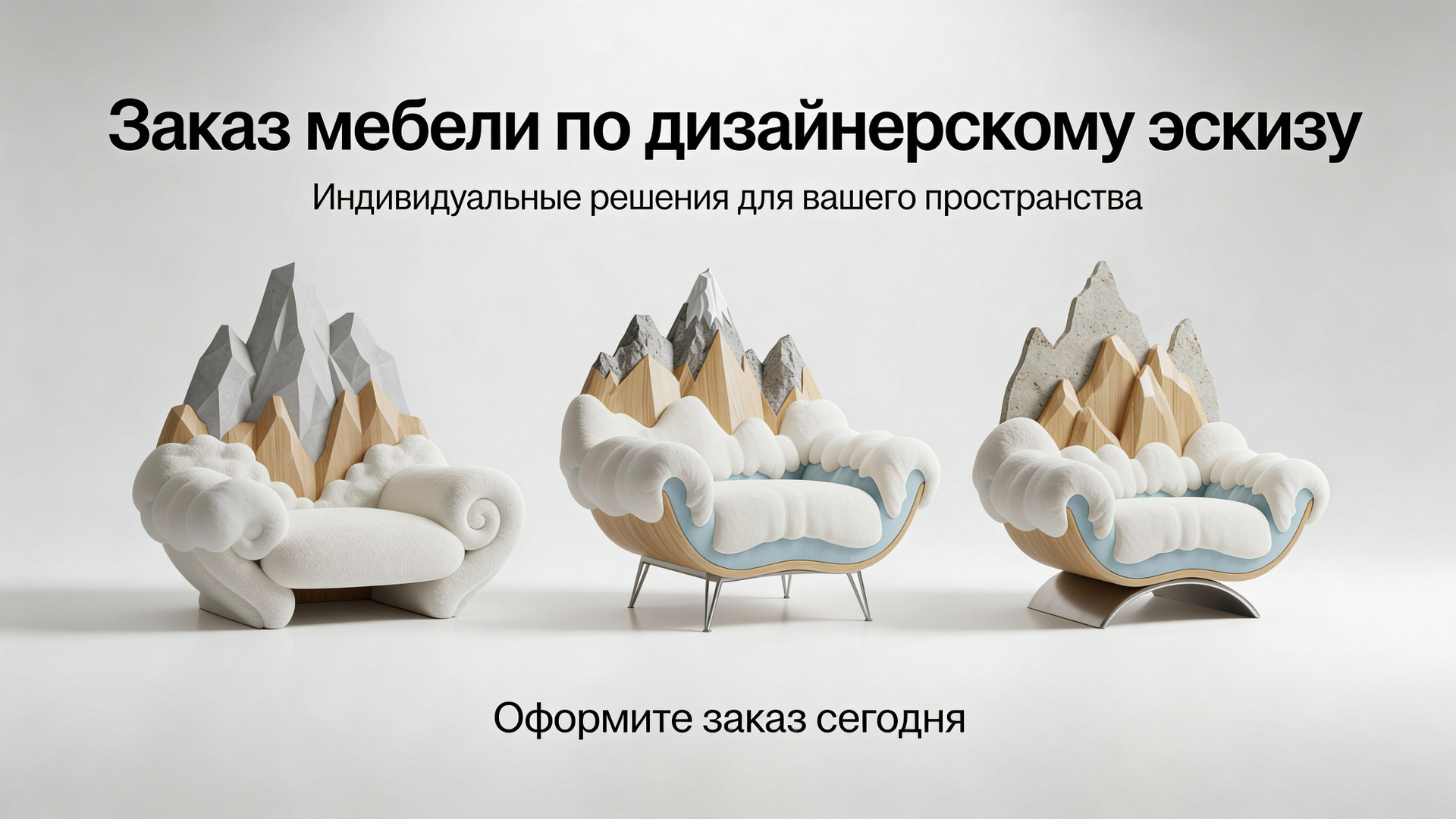 В рамках проекта создавались оригинальные концепты товаров, например «кресла‑горы», которые использовались как визуальные якоря в баннерах, промо‑постах и материалах для маркетплейсов, чтобы привлечь внимание и выделить бренд среди конкурентов.